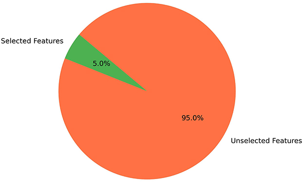 The results showed that model performance steadily improved as the number of features increased, reaching a peak at k = 2,454. Beyond this point, accuracy plateaued up to k = 2,649, after which the performance slightly declined due to the inclusion of noisy or redundant features. Choosing the midpoint of the plateau (k = 2,551, as identified in the fine search) offered the best balance between accuracy and model efficiency, preventing unnecessary feature overhead while maintaining optimal performance. This demonstrates that Chi-square feature selection effectively reduced the dimensionality of SQL query logs while maintaining the most discriminative terms for classification. As shown in Figure 1, the accuracy curve increases sharply before leveling off, with the best point marked at k = 2,551, compared to the coarse peak at k = 2,500, beyond which performance improvements diminished. Based on this curve, the top 2,551 features, approximately 5% of the total 49,607 features, were selected and retained, while the remaining features were not, as shown in the pie chart in Figure 2.