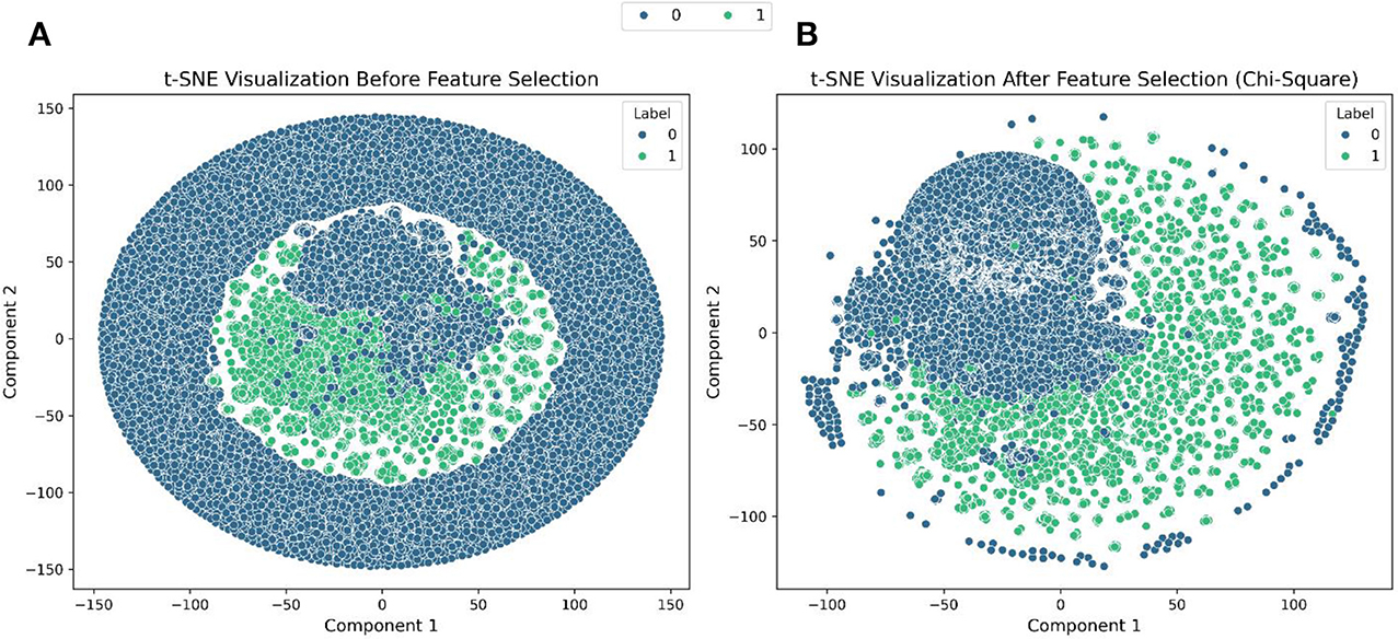 This study employed a visualization technique to understand the distribution of data points across the dataset before and after feature selection. The t-SNE algorithm was used to visualize the feature vectors in two dimensions from high-dimensional data. T-SNE is known for its ability to reveal significant global relationships, while preserving the local structure of the data.