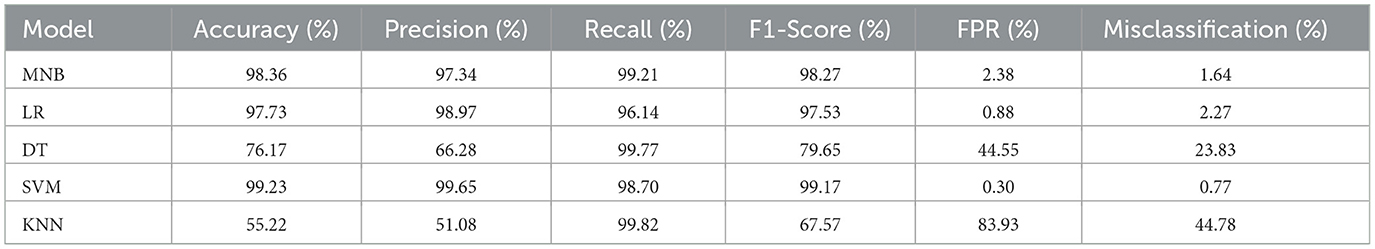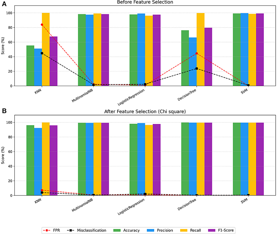 Before feature selection (Table 1 and Figure 4A), SVM, LR, and MNB performed well across all metrics. Meanwhile, the SVM model achieved the highest accuracy (99.23%), precision (99.65%), recall (98.70%), and F1-Score (99.17%), along with the lowest FPR (0.30%) and misclassification rate (0.77%). In contrast, DT and KNN showed the poorest performance on most metrics, with KNN recording the lowest accuracy (55.22%), precision (51.08%), and F1-score (61.57%), as well as the highest FPR (83.93%) and misclassification rate (44.78%).