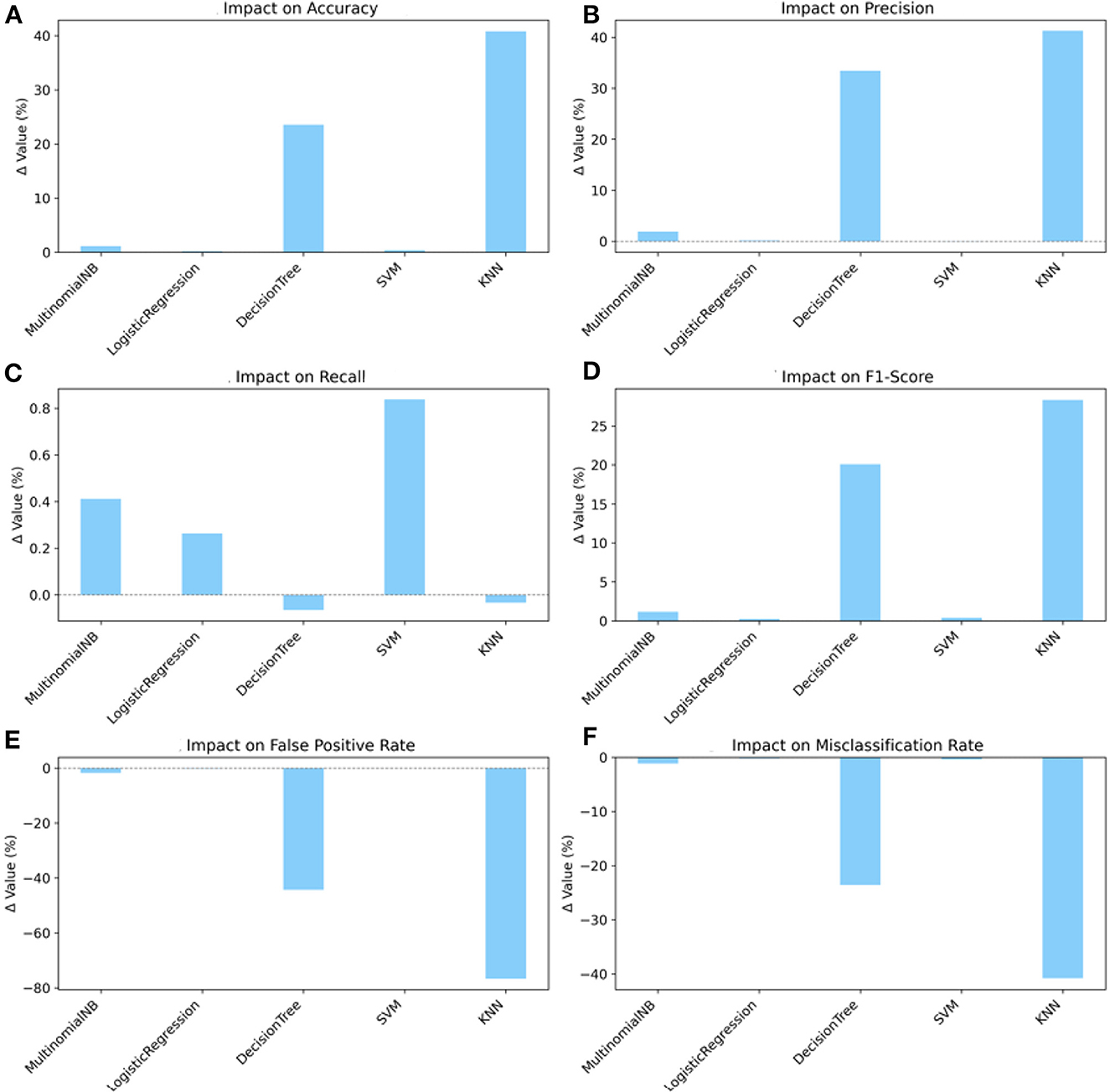 Figure 5. Impact of chi-square feature selection on classifiers' performance. (A) Impact on accuracy. (B) Impact on precision. (C) Impact on recall. (D) Impact on F1-score. (E) Impact on false positive rate. (F) Impact on misclassification rate.
