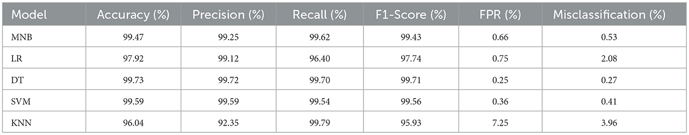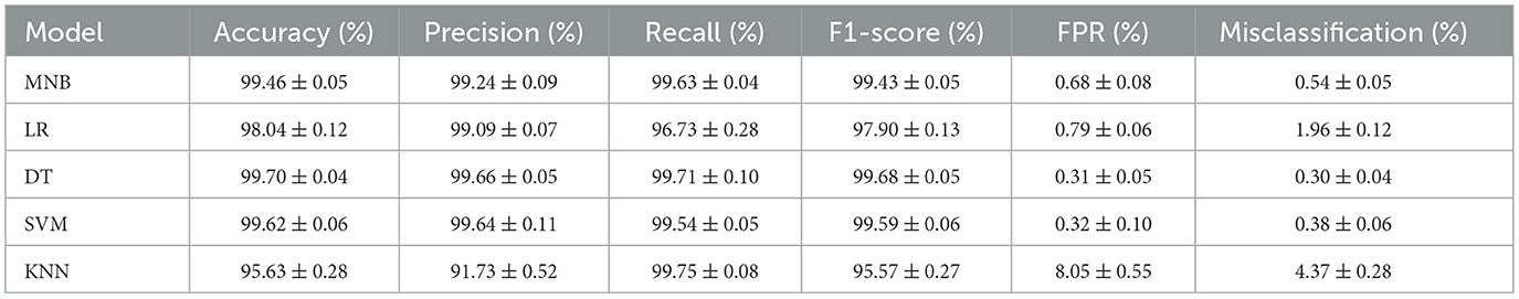 The results from five-fold cross-validation, following Chi-square feature selection, aligned closely with those from the single train-test split, showing only slight variations across different folds (Table 4). The cross-validation outcomes confirmed that the model's performance was consistent across folds, indicating that the results did not depend on a specific train-test split. Decision Tree (DT) achieved the highest performance with an accuracy of 99.70 ± 0.04%, a precision of 99.66 ± 0.05%, a recall of 99.71 ± 0.10%, an F1-score of 99.68 ± 0.05%, a false positive rate of 0.31 ± 0.05%, and a misclassification rate of 0.30 ± 0.04%. Multinomial Naïve Bayes (MNB) and Support Vector Machine (SVM) also performed very well, with an accuracy above 99%, precision and recall above 99%, and low error rates. Logistic Regression (LR) remained steady at an accuracy of 98.04 ± 0.12%, with a precision of 99.09 ± 0.07%, a recall of 96.73 ± 0.28%, an F1-score of 97.90 ± 0.13%, a false positive rate of 0.79 ± 0.06%, and a misclassification of 1.96 ± 0.12%. K-Nearest Neighbors (KNN), though significantly improved after feature selection, was still the lowest-performing model, with an accuracy of 95.63 ± 0.28%, a precision of 91.73 ± 0.52%, a recall of 99.75 ± 0.08%, an F1-score of 95.57 ± 0.27%, a false positive rate of 8.05 ± 0.55%, and a misclassification rate of 4.37 ± 0.28%. Overall, these results demonstrate that the feature selection method is robust, and the model's performance is consistent across various data folds.