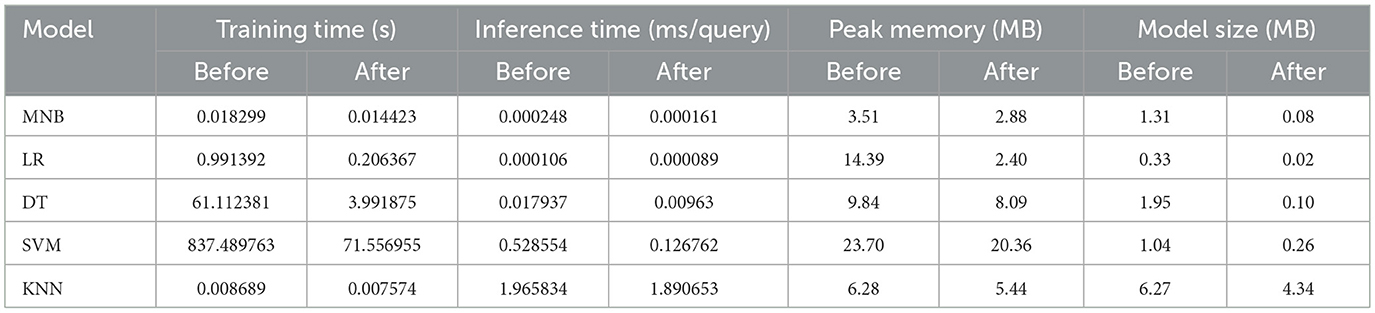 Feature selection significantly improved the computational efficiency of all models, as shown in Table 3. Training time was highest for SVM (837.49 s before, 71.56 s after) and lowest for KNN (0.0087 s before, 0.0076 s after). Inference time per query was highest for KNN (1.966 ms before, 1.891 ms after) and lowest for LR (0.000106 ms before, 0.000089 ms after). Peak memory usage was highest for SVM (23.70 MB before, 20.36 MB after) and lowest for MNB (3.51 MB before, 2.88 MB after). Model size was highest for KNN (6.27 MB before and after) and lowest for MNB (1.31 MB before, 0.08 MB after). Overall, feature selection reduced training time, memory footprint, and model size, while maintaining efficient inference across all models.