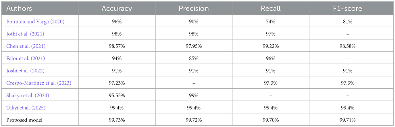 The proposed model's performance was evaluated against various related studies, as shown in Table 5. While deep learning approaches may achieve comparable or superior generalization on larger, heterogeneous datasets, our results show that feature selection with classical ML can achieve competitive accuracy (99.73%) and F1-score (99.71%) with lower computational costs (training time 3.99 s, inference time 0.00963 ms/query, peak memory 8.09 mb, and model size of 0.1 mb). However, these results should be interpreted considering variations in datasets, preprocessing steps, and algorithmic architectures across studies that may have influenced the comparative outcomes. For example, Chen et al. (2021) and Falor et al. (2021) utilized deep learning architectures such as convolutional neural networks (CNNs) trained on tens of thousands of labeled SQL injection and benign samples, focusing on hierarchical feature learning from sequential data. Similarly, Potinteu and Varga (2020), Joshi et al. (2022), and Takyi et al. (2025) employed LSTM-based models capable of capturing temporal dependencies. These methods achieved high accuracy (91%−99.4%) but required large datasets and significant computational resources during training and deployment. Conversely, researchers such as Shakya et al. (2024), Jothi et al. (2021), and Crespo-Martínez et al. (2023) used classical machine learning algorithms such as KNN, SVM, Logistic Regression, and Random Forests, which are more computationally efficient and easier to interpret but often less effective at modeling complex features. The improved performance of the proposed model is credited to the use of feature selection techniques, which enhanced learning efficiency by removing redundant or irrelevant attributes, resulting in more stable classification boundaries and better generalization without the high computational costs associated with deep learning. From a deployment perspective, this approach is lightweight and suitable for real-time or resource-limited environments such as institutional web applications and local information systems. In conclusion, while the proposed model performed well, its advantages should be considered within the context of dataset variability, preprocessing methods, and algorithmic architectures.