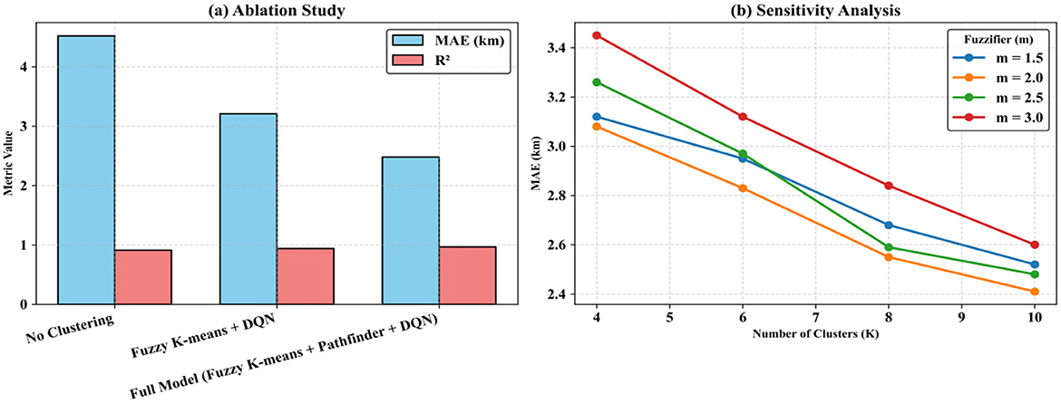 Figure 3 compares the performances of the proposed model in various configurations. Figure 3a provides a comparison of three setups, such as No Clustering, Fuzzy K-Means + DQN, and Full Model (Fuzzy K-Means + Pathfinder + DQN). The results indicate that MAE decreases progressively from 4.52 km to 2.48 km, while R2 improves from 0.912 to 0.967. From here, it is confirmed that both fuzzy clustering and pathfinder optimization have a great contribution to accuracy. Figure 3b shows the sensitivity analysis of the number of clusters (K) and fuzzifier (m) to MAE. It can be clearly noted that the error constantly decreases when increasing K. The best performance was achieved at K = 6 and m = 2.0. This finding justifies the selected configuration of the proposed approach and depicts that the integration of a data preprocessing module with an optimization module produces a balanced trade-off between accuracy and computational efficiency.