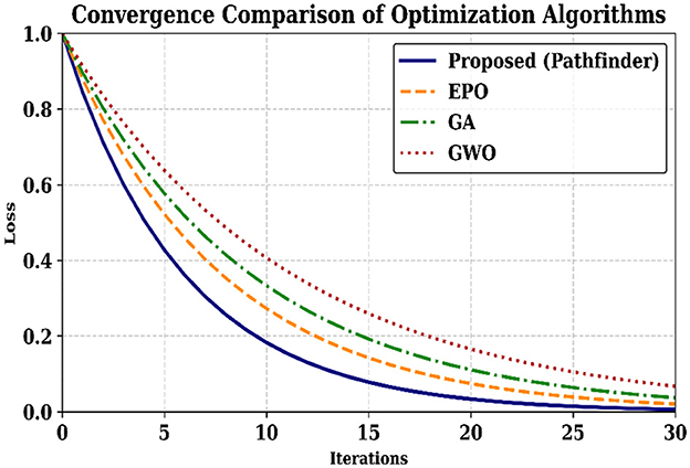 The convergence comparison observed in the optimization algorithm is represented in Figure 4. The blue curve (Proposed – Pathfinder) shows the fastest convergence and stabilization starting around the 20th complete iteration, with the least loss. Other optimizers extended more iterations and plateaued to higher loss value, specifically EPO, GA, and GWO show inefficient learning. The plotting results confirm that the Pathfinder optimized model is a fit for reward modeling and action-value for fine tuning in the Deep Q-Network.