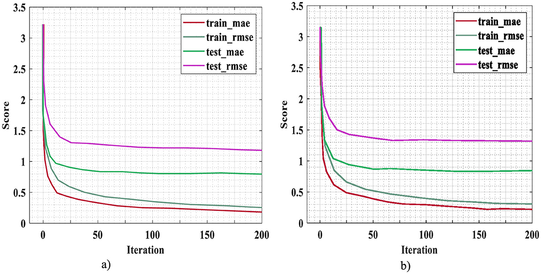 The proposed method has been analyzed for mean absolute error (MAE), root mean square error (RMSE), and mean absolute percentage error (MAPE). The testing and training MAE and RMSE are provided in Figure 5a for an independent run, and Figure 5b 10-fold cross-validation. From the plot, it is clear that training and testing MAE are highly reduced, whereas the RMSE for training and testing scores is higher than MAE.