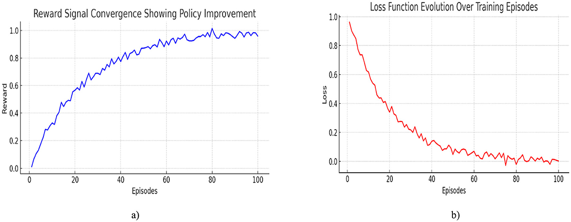 Figure 7. (a) Loss function evolution over training episodes (b) reward signal convergence showing policy improvement.