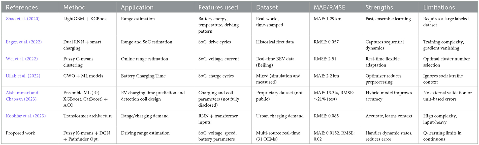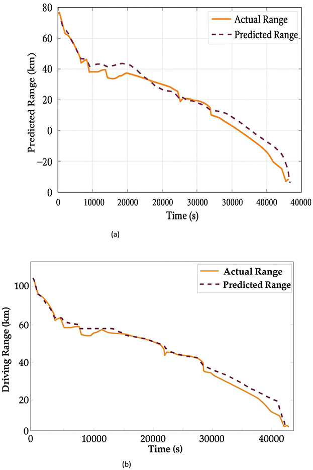 Accurately predicting the electric vehicle range is quite a big challenge due to large variations in both battery dynamics and driving conditions. In most model applications of range prediction through machine learning, there are difficulties regarding dynamic adaptability and generalization across different types of vehicles (Kumar and Alok, 2020; Sanguesa et al., 2021). Electric vehicles are widely promoted as an environmentally friendly transportation option, but their actual environmental impact strongly depends on the energy mix used for charging. Electricity from renewable sources such as solar, wind, or hydro power can lead to significant reductions in greenhouse gas emissions and air pollutants when used by EVs. However, in regions where electricity generation still relies on fossil fuels like coal or oil, the overall lifecycle emissions of EVs may approach or even exceed those of efficient internal combustion vehicles. Therefore, assessing EV sustainability requires consideration of both battery performance and the carbon intensity of the local power grid. However, a major complication that arose in the development of electric vehicles is the power battery. To enhance the performance of the battery in each driving experience, the electric vehicle is equipped with a lithium-ion battery (Tian et al., 2020). The battery offers a long lifespan, high energy density (Rallo et al., 2020), and the ability to provide high energy density (Pande and Khekare, 2024; Khan et al., 2023). The batteries used in electric vehicles are complex since they tend to experience problems such as battery degradation (Mahmud et al., 2023), self-discharge, unmanaged energy usage, by using energy to operate the entire vehicle to be operated, and thermal runaway (Chavan et al., 2023; Yao et al., 2021; Dhote et al., 2023). The state of health (Wu et al., 2022) and state of charge (Kim and Chung, 2023) are the parameters that reflect the capacity of the battery to some extent. Due to the internal reactions of the battery, the state of health estimation is not accurate (Nuroldayeva et al., 2023). The uncontrolled and prolonged distribution of thermal effect and load current causes the battery to suffer from inconsistency, which directly influences the state of charge (SoC) of the battery, terminal voltage and output energy.