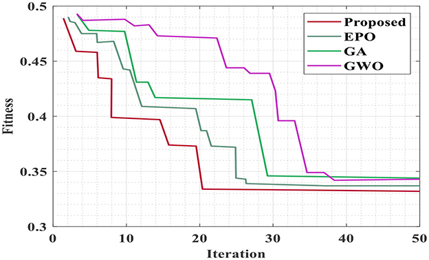 The convergence of optimization is compared with existing algorithms such as emperor penguin optimization (EPO), genetic algorithm (GA), and gray wolf optimization (GWO), as shown in Figure 9. As a result, the proposed method has reached the global minimal value with the 20th iteration, whereas the other optimization takes 27, 29, and 38 iterations with high error values for EPO, GA, and GWO, respectively.