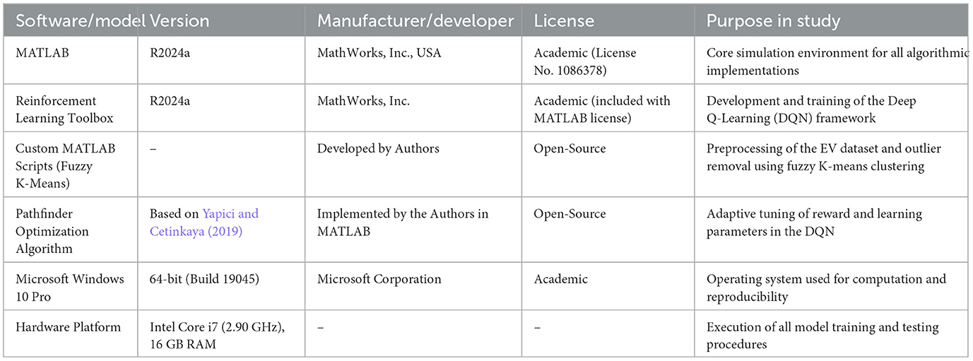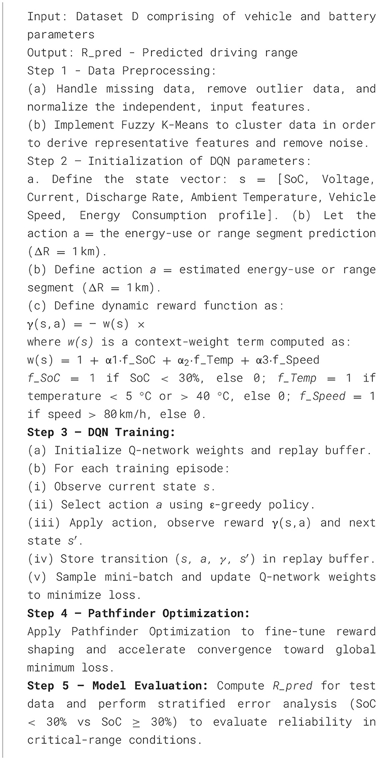 This study presented the design of a DRL framework to produce accurate driving range estimation for EVs. The proposed method considers range prediction as a decision-making process rather than a regression problem, able to encapsulate the underlying complex time-dependent interactions of battery, vehicle performance and ambient factors. Furthermore, to stabilize learning and mitigate predictive errors as they propagate in time, the Q-learning process is enhanced through the Pathfinder metaheuristic algorithm which adaptively tunes the rewards and learning factors to promote faster convergences. Before model training, data are preprocessed through a fuzzy k-means clustering algorithm that removes outliers and selects, from multiple EV datasets, the most relevant features to feed into the model, hence enhancing model reliability. The simulations were run in MATLAB R2023a. Deep Q-learning applied the Reinforcement Learning Toolbox, while fuzzy k-means clustering was part of bespoke MATLAB scripts. Pathfinder optimization was implemented based on the formulation of Yapici and Cetinkaya (2019). Calculations were performed with an Intel Core i7 processor and 16 GB RAM. All models and software packages used are shown in detail in Table 2.