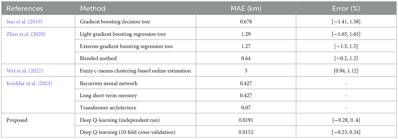 To validate the effectiveness of the proposed DRL-based range prediction framework, we compare its performance with recent state-of-the-art (SOTA) methods reported in the literature and implemented on our dataset under the same conditions: