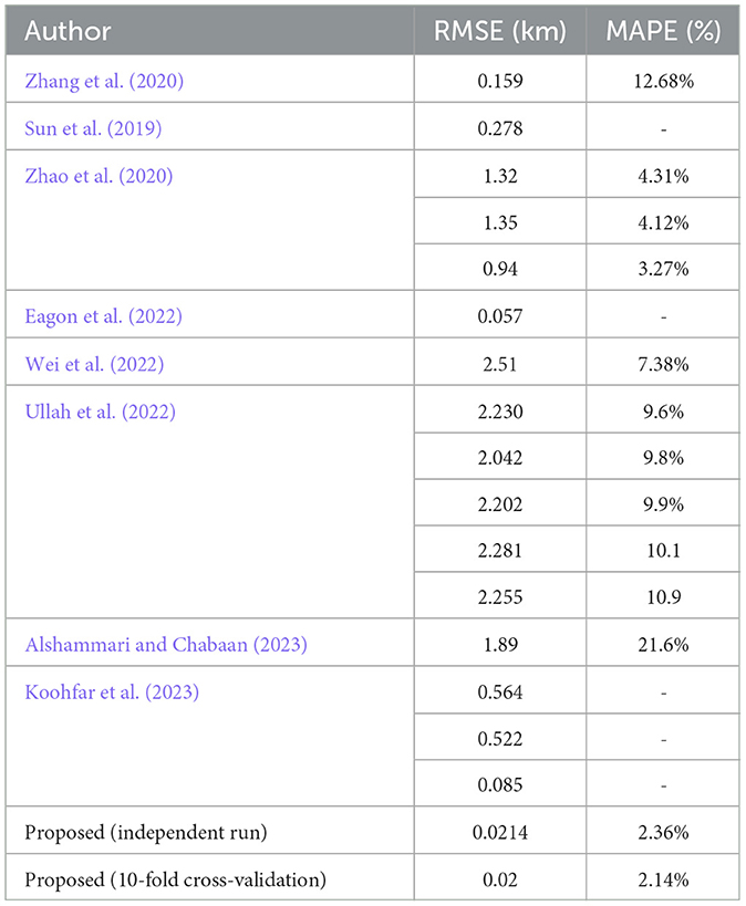 The RMSE of the proposed method is 0.0214 km when compared with other methods; the value is highly reduced. The proposed method reduced the RMSE to 6.36% with a transformer architecture and 3.56% with two recurrent neural networks.