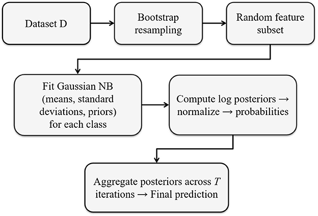 This framework combines the low-bias property of GNB with the variance-reduction effects of bootstrap aggregation and the decorrelation benefit of random subspaces. The final model object stores: $n_iter, $feature_fraction, $cores, $models, $classes, $X_train, and $y_train, accessible via standard S3 methods [print(), summary(), predict()].Figure 1 illustrates the overall workflow of the RandomGaussianNB algorithm, summarizing the key steps of stratified bootstrap resampling, random feature selection, GNB fitting, and posterior aggregation across ensemble iterations.