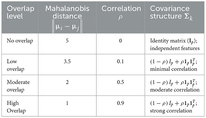 Class overlap is regulated by adjusting μk and Σk. Separability is characterized using Mahalanobis distances between class means and controlled correlation parameters. Following Schober et al. (2018), correlation thresholds are interpreted as minimal (ρ = 0.1), moderate (ρ = 0.5), and strong (ρ = 0.9) associations, while the identity structure (ρ = 0) reflects independence. The systematically defined scenarios are summarized in Table 1.