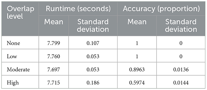Baseline experiments established reference performance under controlled conditions. Simulations used a fixed dataset size n = 1,000, dimensionality p = 50, three-class classification K = 3, feature fraction f = 0.25, number of iterations T = 100, and single-core computation (c = 1). Four class-overlap levels—no overlap (||μi − μj|| ≈ 5, ρ = 0), low overlap (≈ 3.5, ρ = 0.1), moderate overlap (≈ 2, ρ = 0.5), and high overlap (≈ 1, ρ = 0.9)— quantified the influence of data separability on accuracy and runtime.