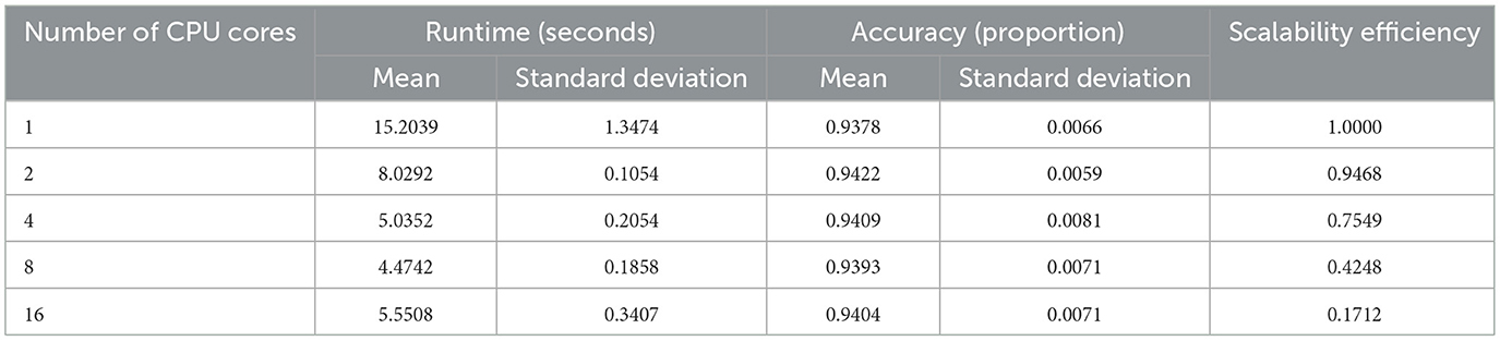 To examine efficiency gains from parallel computation, moderate complexity parameters (n = 5000, p = 100, K = 3, f = 0.25, T = 100, ρ = 0.5) were retained while varying CPU cores c ∈ {1, 2, 4, 8, 16}. This analysis quantified runtime reduction and scalability efficiency Es under increasing parallel resources.