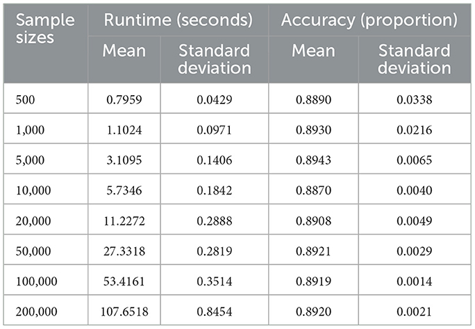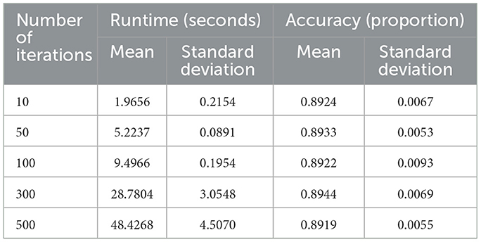 Finally, predictive stability was examined by varying the number of bootstrap iterations T = {10, 50, 100, 300, 500} while maintaining moderate complexity settings (n = 5000, p = 100, K = 3, c = 4, f = 0.25, ρ = 0.5). This assessed consistency of accuracy and runtime across repeated resampling.