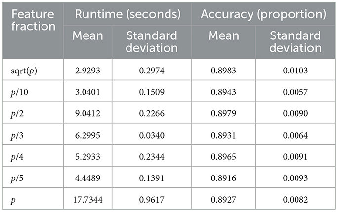 The effect of randomized feature selection was investigated by varying the feature fraction keeping other parameters fixed (n = 5000, p = 100, K = 3, c = 4, T = 100, ρ = 0.5). This clarified how subsampling proportions influence accuracy and runtime.