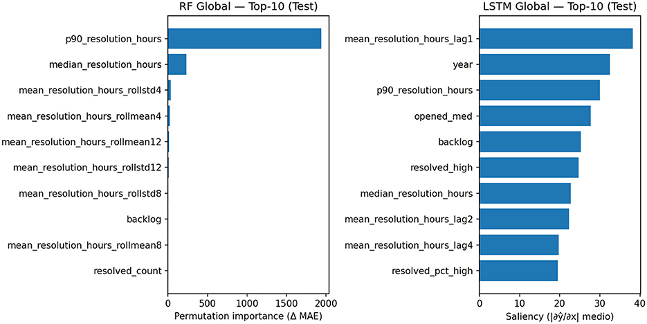 The global LSTM, on the other hand, builds the forecast by combining explicit target memories (lag1/lag2/lag4) with calendar cues (year), distribution tails (p90), and weekly workload (opened_med, backlog, resolved_high, resolved_pct_high). This profile suggests that the neural network jointly leverages temporal inertia and operational cues; however, the greater dispersion of importance across multiple features is consistent with the performance variability observed in the global results.
