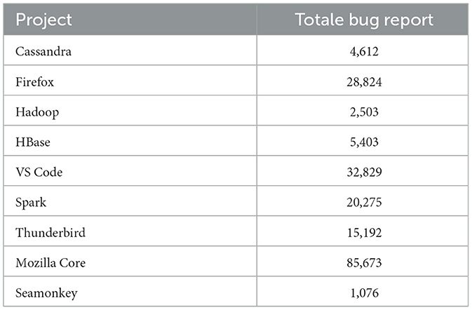 Table 1 shows the distribution of bug reports across projects included in GitBugs. Significant heterogeneity is observed in terms of dataset size: projects like Mozilla Core and VS Code have tens of thousands of reports, while smaller systems like Seamonkey or Hadoop have small volumes. This variability makes the dataset particularly interesting for comparative analyses, as it allows us to evaluate the performance of models both in contexts with a high density of reports and in rarer, sparsely populated scenarios. Furthermore, the presence of different domains (distributed databases, big data frameworks, browsers, IDEs, email clients) provides a variety that allows us to test the generalization ability of forecasting models.