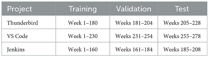 To clarify the strategy adopted in temporally splitting the data, Table 2 shows an example of the chronological partition applied to three representative projects. For each project, all weekly observations were divided into three contiguous segments: an initial training period used to train the models, a 24-week validation block used for hyperparameter selection and early stopping activation, and a final 24-week testing block intended exclusively for evaluation on unseen future data. This strategy rigorously maintains the temporal order of events and avoids any form of data leakage, ensuring that the evaluation reflects a realistic forecasting scenario.