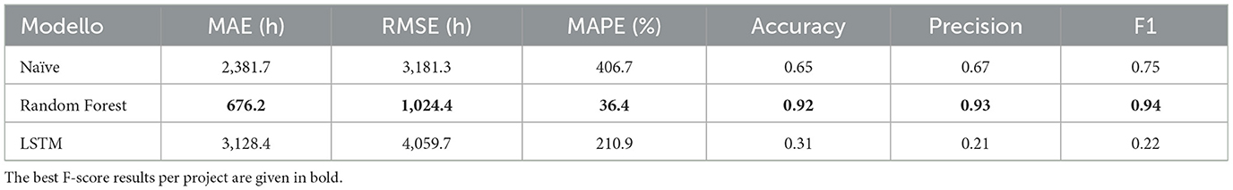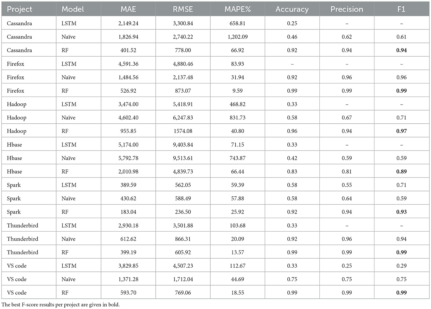 A more detailed analysis of the results by project, reported in Table 4, confirms the picture emerging from the average performance, but also highlights significant differences between the various systems. For some projects with relatively stable data sets, such as Firefox, Thunderbird, and Spark, the naïve model already achieves good results, with MAPE values below 60% and high classification metrics. In these cases, the temporal persistence of the solution process makes the simple projection of the last value a surprisingly competitive approach. However, Random Forest still manages to further improve accuracy, reducing the mean error (MAE) to around 200 h in Spark and less than 400 h in Thunderbird, achieving near-perfect performance even in classification metrics (Accuracy and F1 equal to 1.00 in more than one case). In the Cassandra, Hadoop, and Hbase projects, which feature noisier and more irregular data sets, the differences between the models become more pronounced. Here, the naïve model shows clear limitations, with very high MAPE values (up to over 700%), while the Random Forest proves robust, maintaining lower errors (MAE in the range of 400–2,000 h depending on the project). LSTMs, on the other hand, fail to adapt adequately: in almost all cases, they report zero classification metrics and very high error values, a sign of an intrinsic difficulty in learning useful patterns from short, highly variable data sets when working at the single-project level. Finally, VS Code represents an intermediate case: the naïve model achieves reasonable performance (MAE about 1,371 h, Accuracy = 0.75), but the Random Forest manages to reduce the average error by more than half while maintaining perfect classification. Here too, the LSTMs show no improvement, with errors exceeding 3,800 h. Overall, the project-specific results reinforce the evidence that Random Forests are the most reliable model in the local setting, adapting well to both more stable and more variable contexts. Naïve baselines remain useful only in scenarios with strong temporal inertia, while sequential deep learning models systematically suffer from data scarcity and fail to exploit their potential in the absence of multi-project pooling.
