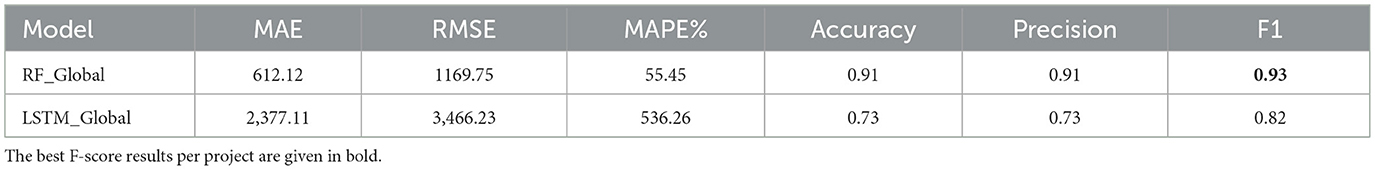 The global Random Forest model achieves significantly better performance, with an average MAE of approximately 612 h and a MAPE% around 55%, while maintaining high classification accuracy (0.91) and an F1 score above 0.93. This suggests that, despite their simplicity, tree-based ensembles can robustly capture cross-project regularities. In contrast, the global LSTM model, while theoretically benefiting from the ability to model long-term temporal dependencies, exhibits very high errors (MAE about 2,377 h, MAPE% over 500%), with lower classification performance (Accuracy 0.73, F1 0.82). This indicates that, at least in our setting and with the size of the available dataset, sequential architectures failed to generalize effectively in predicting solution time.