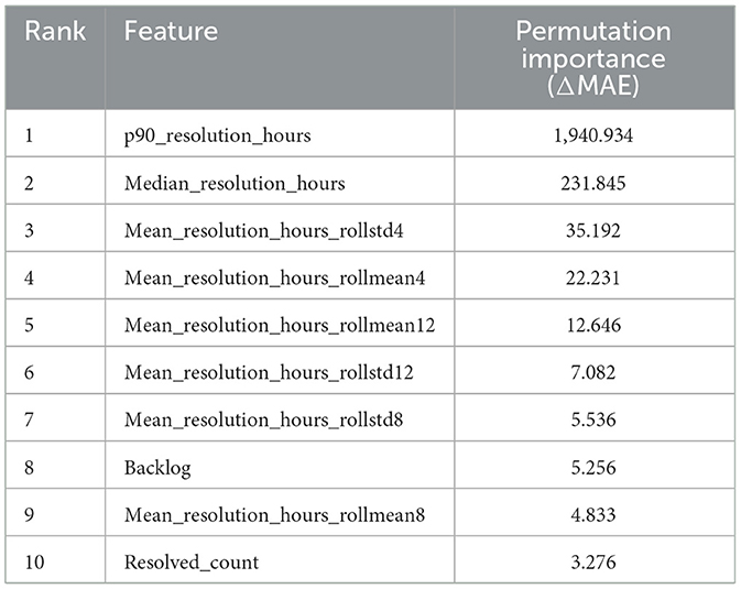 For Random Forest-based models, Permutation Feature Importance was applied, which evaluates the impact of each variable on the predictive result by measuring the increase in error when the feature values are randomly permuted. This robust and intuitive technique allows us to identify the variables that most influence the average resolution time, such as the weekly backlog or the proportion of high-priority bugs.