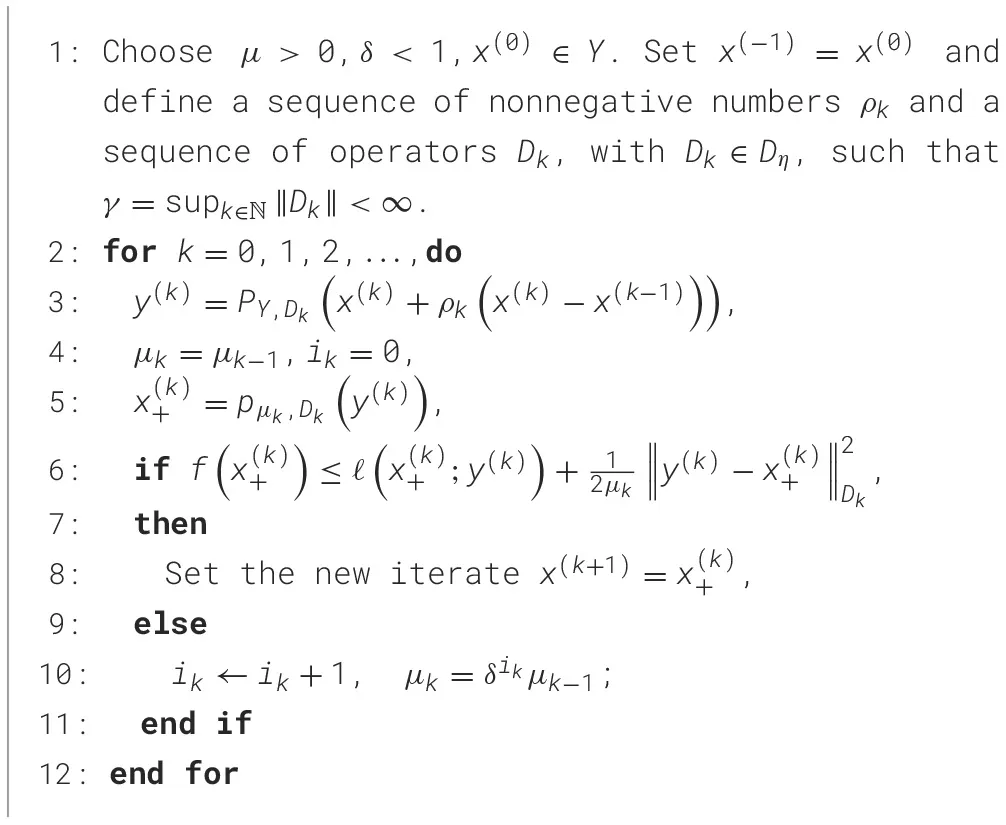 The algorithm consists of variable metric with forward-backward iterations (line 6) combined with an extrapolation-projection step (line 3) The step size μk is dynamically determined through a backtracking process. It is worth noting that the choice of the extrapolation parameter ρk and the scaling operator Dk require thoughtful selection. Specifically, ρk takes the form ρk = θk(1−θk−1)/θk−1 with ρ0 = 0 and θk∈(0, 1] for k≥0. For the scaling operator , it holds Dk+1≼(1+ηk)Dk for ∀k≥0, with ηk∈ℝ+ satisfying , and supk∈ℕ∥Dk∥ = γ < ∞.