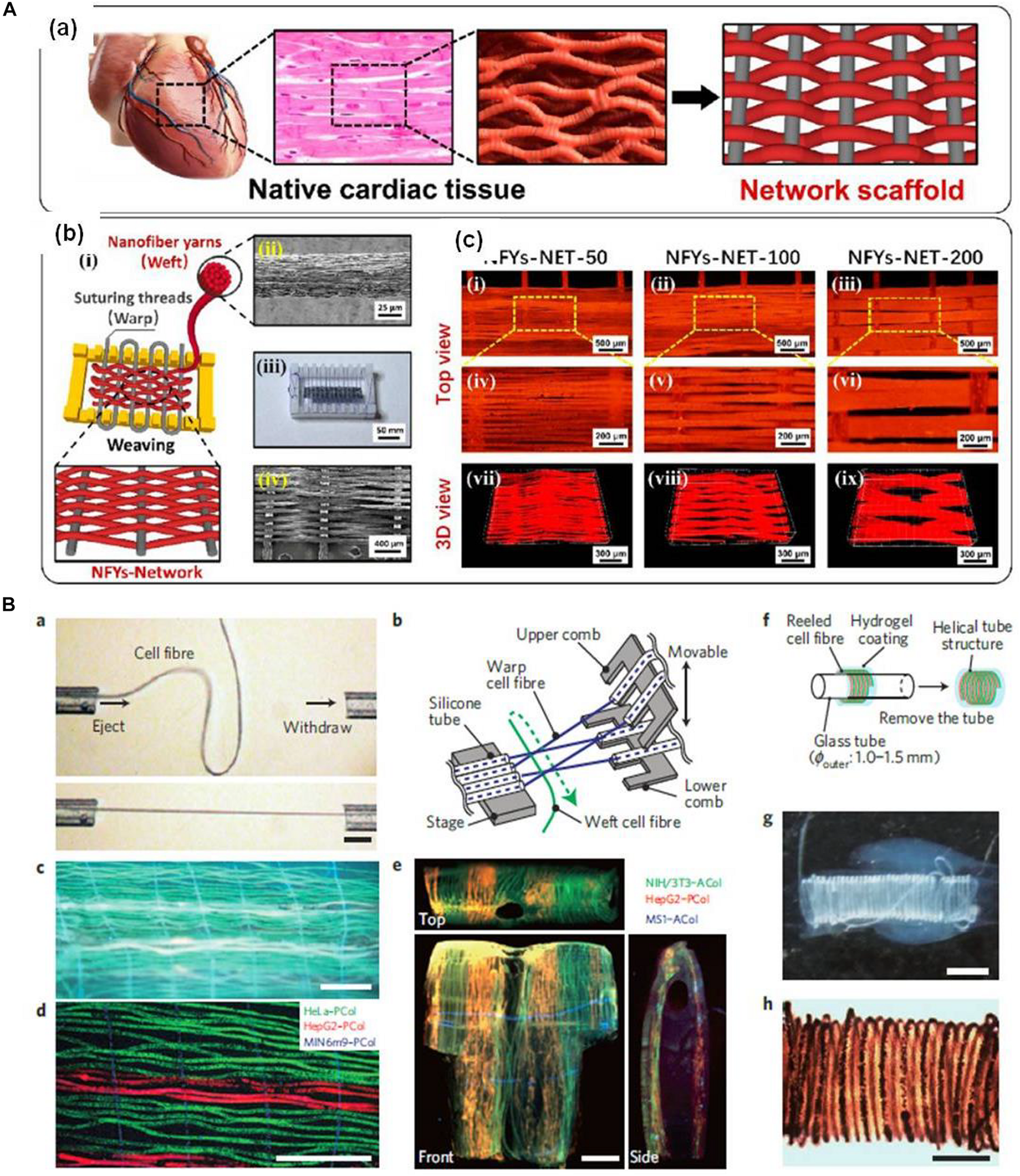 Figure 1. (A) An interwoven aligned conductive nanofiber yarn/hydrogel hybrid scaffolds for mimicking the native cardiac tissue structure (reproduced with permission from Wu et al., 2017). (B) A thin, long, and finely handleable cell fiber fabricated by using a microfluidic device (reproduced with permission from Onoe et al., 2013).