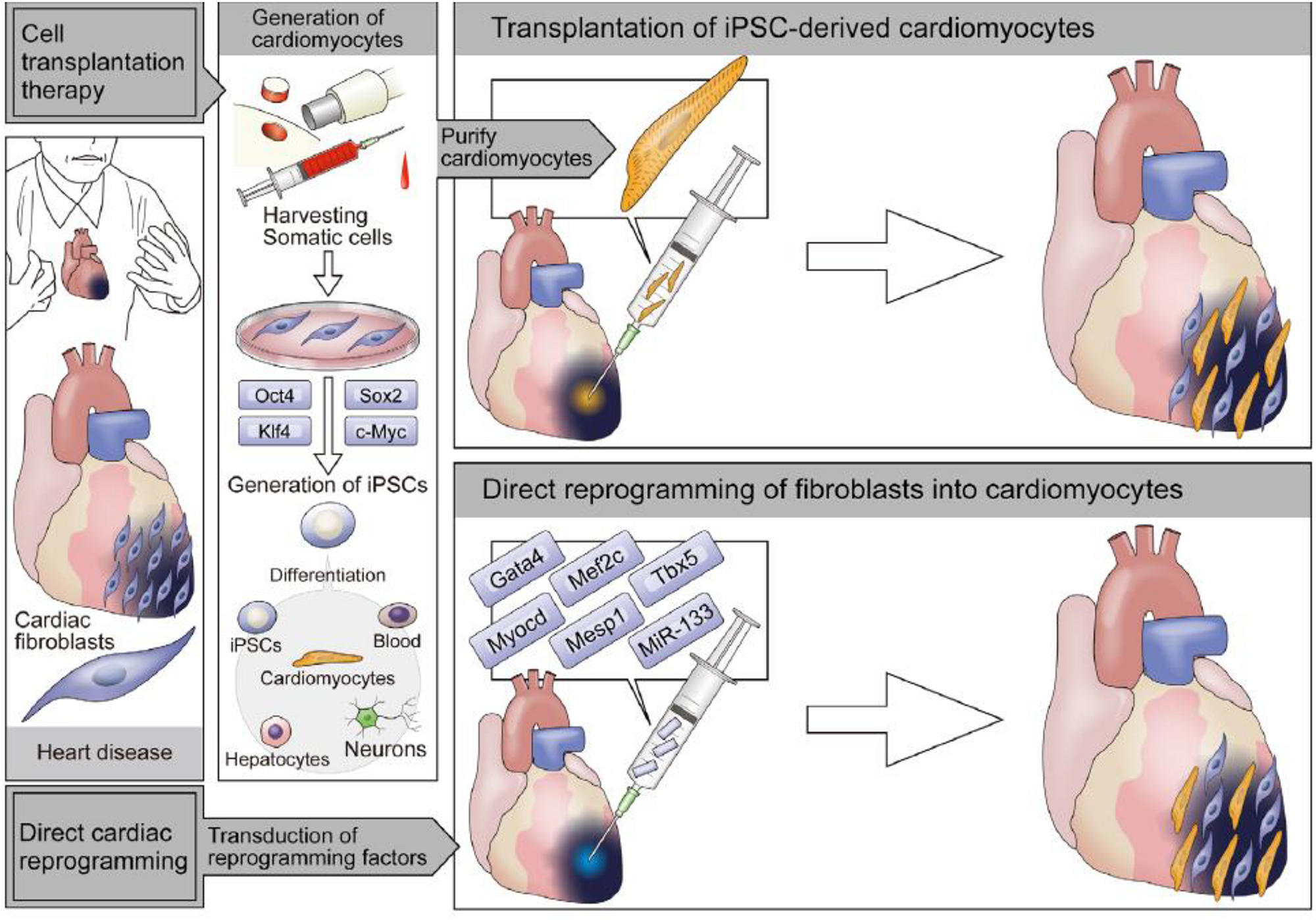 Figure 2. Future cardiac regenerative therapy by cell transplantation-based approach using iPS cell-derived cardiomyocytes (Upper) and direct cardiac reprogramming approach (Lower) (reproduced with permission from Sadahiro et al., 2015).
