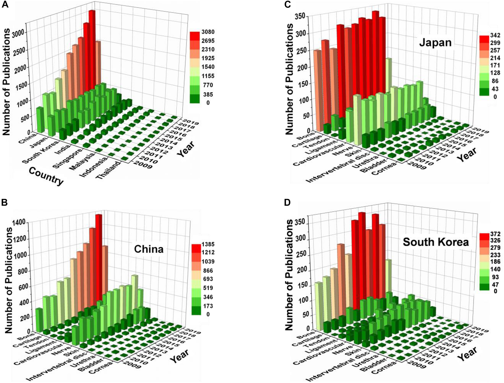 Figure 3. The number of publications in different Asian countries (A), and different fields in China (B), Japan (C), and South Korea (D) from 2009 to 2019.