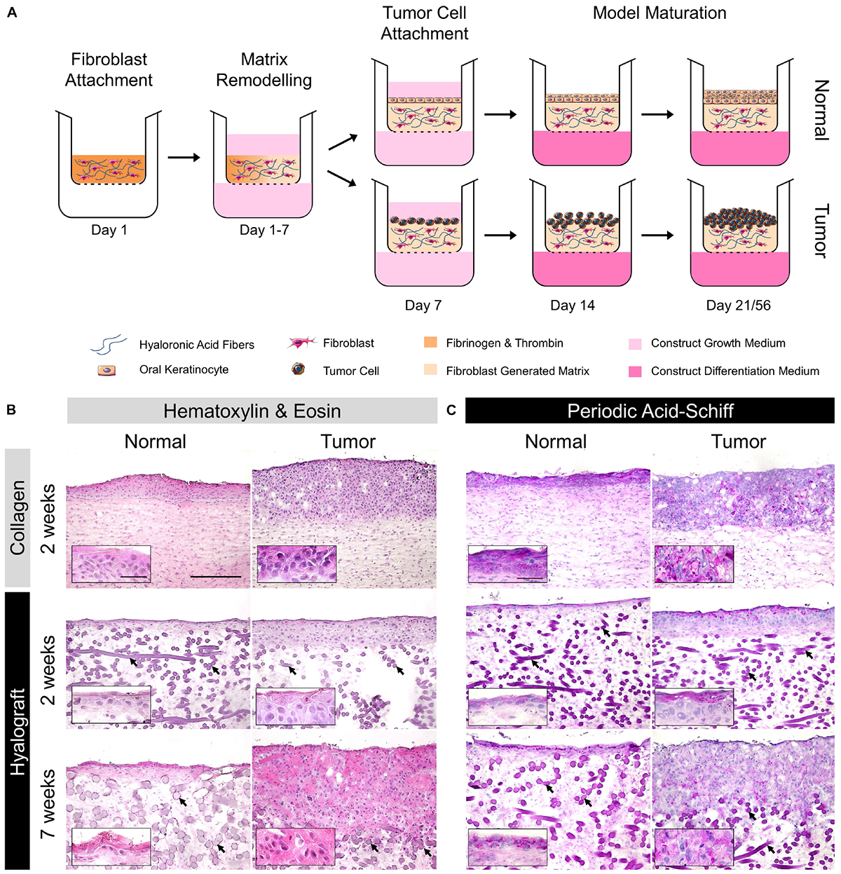 Procedure outline and morphology of NOM and TOM models. (A) Human oral fibroblasts were suspended in a fibrinogen/thrombin solution and poured into a patch with esterified hyaluronic acid fibers (Hyalograft-3D). Fibroblasts replaced the fibrin gel by their own extracellular matrix (day 1–7). Normal oral keratinocytes or tumor cells were seeded on day 7 onto the matrix and grew until day 21 or 56 (2 or 7 weeks with tumor cells). (B) Hematoxylin and eosin and (C) Periodic Acid-Schiff staining. Dark purple structures in both stainings of the lamina propria were hyaluronic acid fibers of the scaffold (black arrows). The inserts show the difference between normal and tumor cell morphology by higher magnification. Representative images from the analysis of up to three batches are presented. Scale bars = 250 and 50 μm in the inserts.