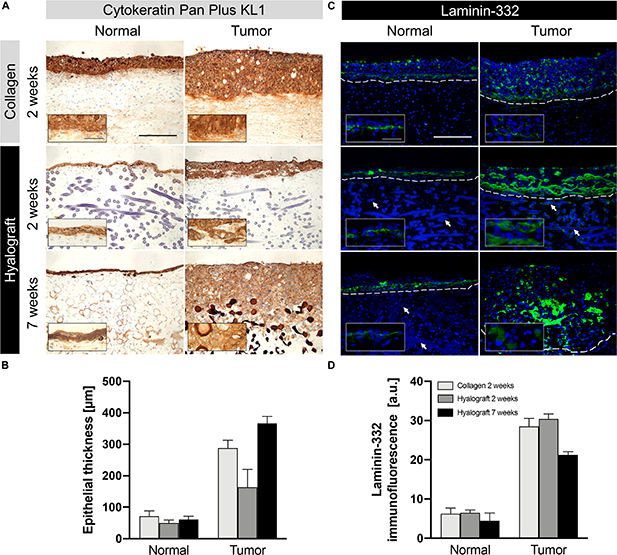 Expression of cytokeratin and laminin-332 in NOM and TOM models. (A) Cytokeratin staining (brown) showed the absence of invasive growth in NOM and c-TOM models. In contrast, nests of cytokeratin positive cells started to infiltrate the lamina propria in h-TOM models after 2 weeks and markedly separated into single cells after 7 weeks. (B) Epithelial thickness in TOM models exceeded those in NOM models. The highest value occurred in h-TOM models after 7 weeks. (C,D) Laminin-332 (green) expression was restricted to a small layer in NOM models and diffusely clustered in TOM models. DAPI stained nuclei and fibers in blue, which could however be distinguished by their size and shape. The inserts show the border between epithelial cells and the matrix, with highest infiltration of the tumor cells in the 7 weeks cultured hyalograft-models, by higher magnification. White arrows highlight fibers and dashed lines indicate the border between epithelium and lamina propria. Representative images from up to three independent cultures are presented. Scale bars = 250 and 50 μm in the inserts. Bar graphs show the mean + SD from the quantitative analysis of up to six regions of interest.