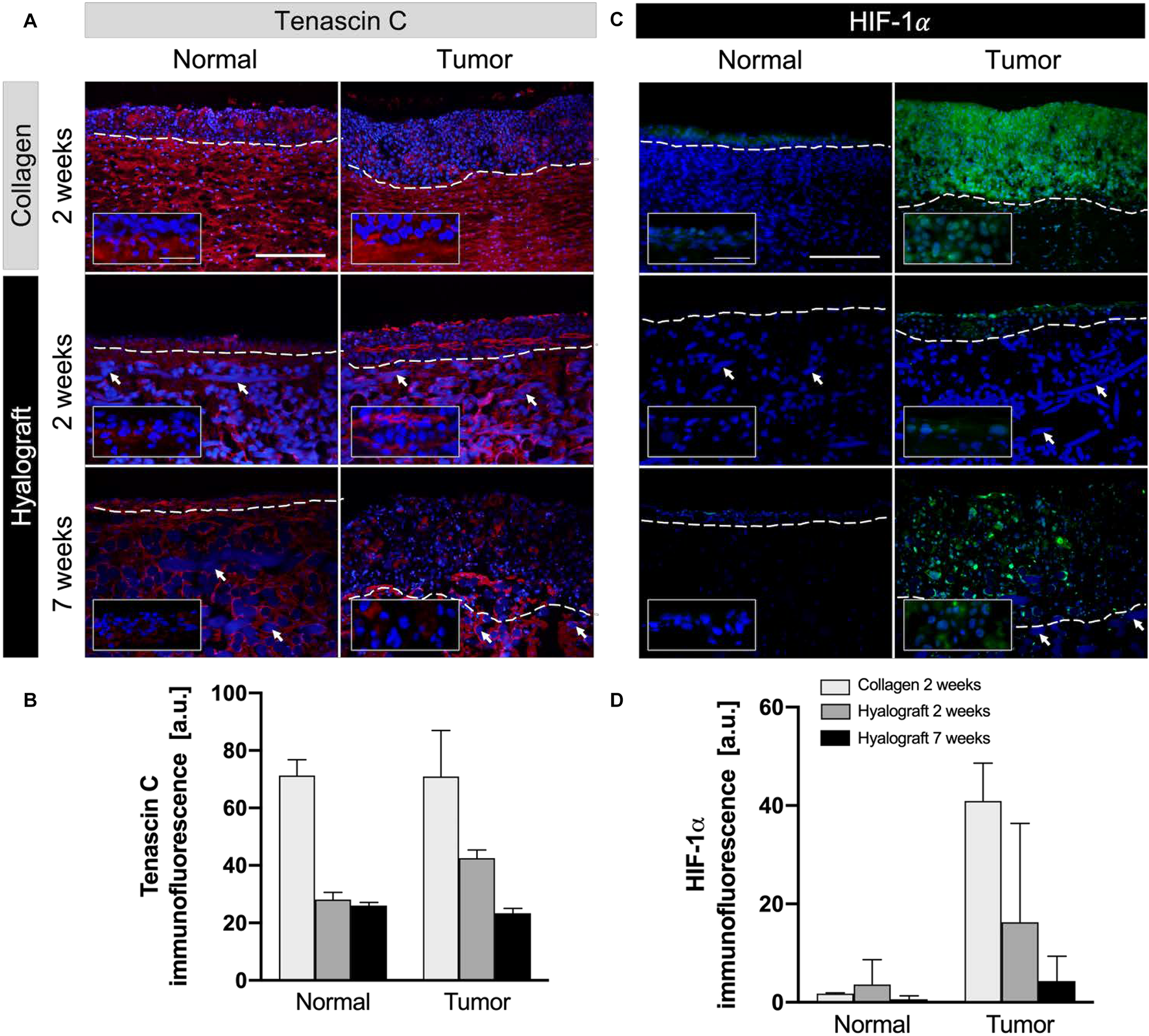 Expression of tenascin c and HIF-1α in NOM and TOM models. (A,B) Tenascin c (red) was less expressed in hyalograft-based models than collagen-based models and further decreased during cultivation. (C,D) HIF-1α (green) showed increased expression in TOM models, with matrix-dependent differences. DAPI stained nuclei and fibers in blue. The inserts show the border between epithelial cells and the matrix for the tenascin C staining and highlights of the HIF-1α staining by higher magnification. White arrows highlight fibers and dashed lines indicate the border between epithelium and lamina propria. Representative images from up to three independent cultures are presented. Scale bar = 250 and 50 μm in the inserts. Bar graphs show the mean + SD from the quantitative analysis of up to six regions of interest of interest.