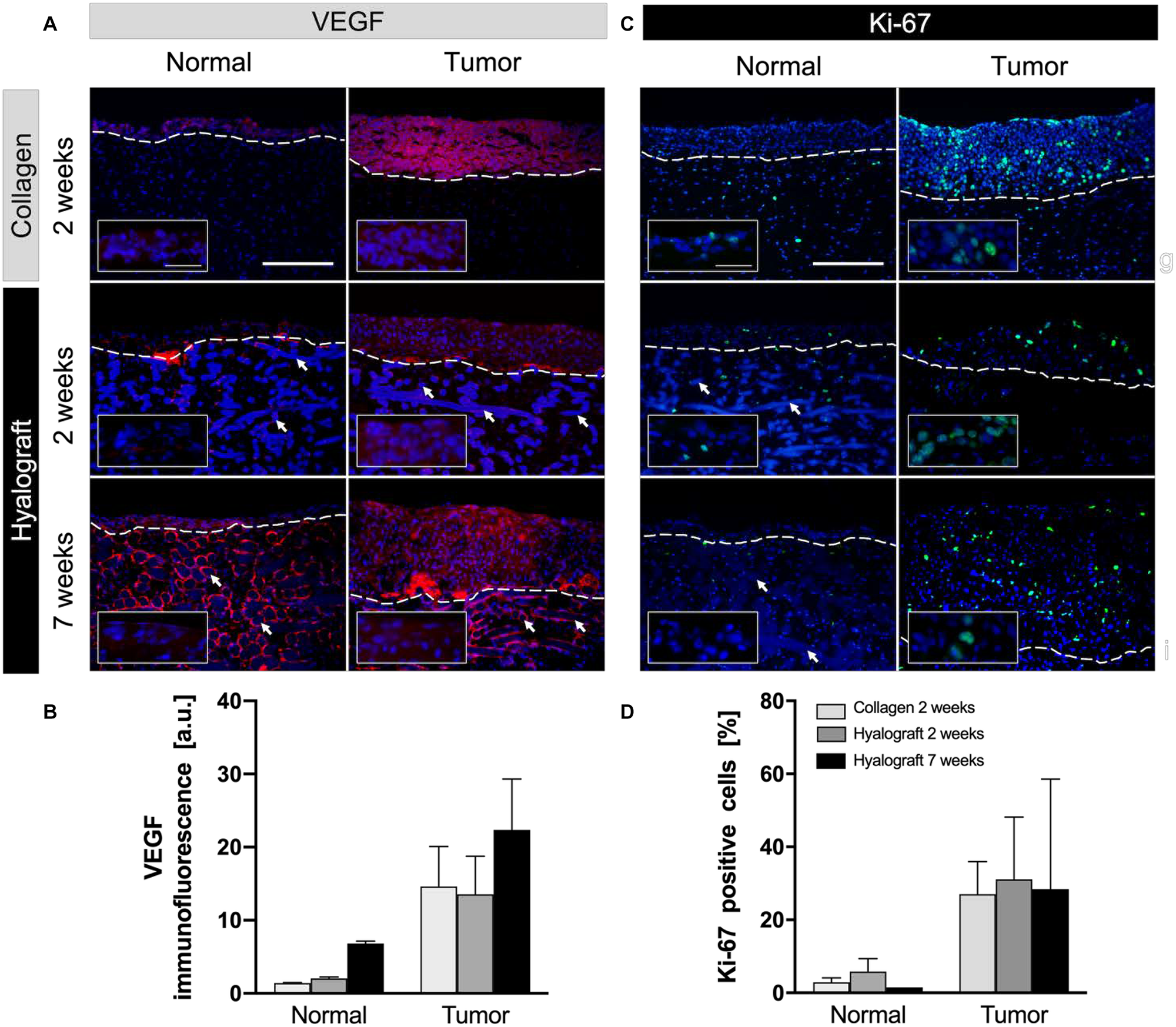 Overall, vascular endothelial growth factor (VEGF) was expressed at similar levels in the c-TOM and h-TOM models; however, the type of matrix interfered with its localization. While VEGF was detected in the entire tumor areas of c-TOM models, it was restricted to the border between the tumor layer and the lamina propria in h-TOM models (Figures 4A,B). VEGF expression further increased after 7 weeks both in NOM and TOM models (p > 0.05). Increased VEGF levels were particularly observed close to hyaluronic acid fibers in h-NOM models.