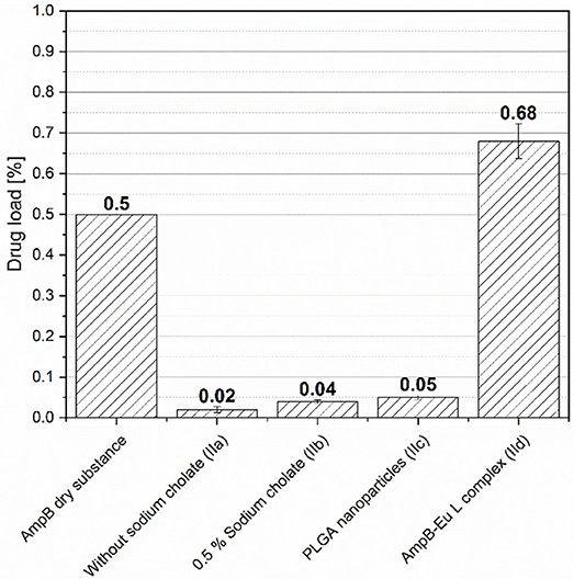 The preparation of the AmpB complex (AmpB-Eu L) (Id) was carried out by a modified method described previously for AmpB with poly(glutamic acid) (Mohamed-Ahmed et al., 2013). Different AmpB solutions in DMSO were prepared (10, 20, and 30 mg/ml) as well as one Eudragit L solution (Eu-L) with 30 mg/ml prepared in DMSO. Thereafter, 1 ml Eu-L solution was dropped into 1 ml of AmpB solution. The mixture was stirred for 1 h at 600 rpm under light protection. Then, 200 μl of a 1 M aqueous sodium hydroxide was dropped into the AmpB-Eu L solution (1 drop/5 s), followed by dropwise addition of 1 ml 0.2 M sodium hydroxide to the same solution. Subsequently, the solution was dropped into 12.5 ml filtrated water (the water was filtrated through a 0.22 μm PES filter before the experiment). The dilution was stirred again for 1 h at 200 rpm under light protection. To remove residual solvent and non-complexed AmpB, the solution was placed in a dialysis bag (Nadir®-Dialysis Tubing, 10–20 kDa, ø 50 mm, Carl Roth GmbH + Co. KG, Karlsruhe, Germany) and was purified by stirring for 24 h in 3 l distilled water. After the purification step the solution was frozen in liquid nitrogen and freeze dried for 24 h. The lyophilisation process was performed the same way described in section Drug Load and Entrapment Efficiency of the PLGA Nanoparticles (Ic).