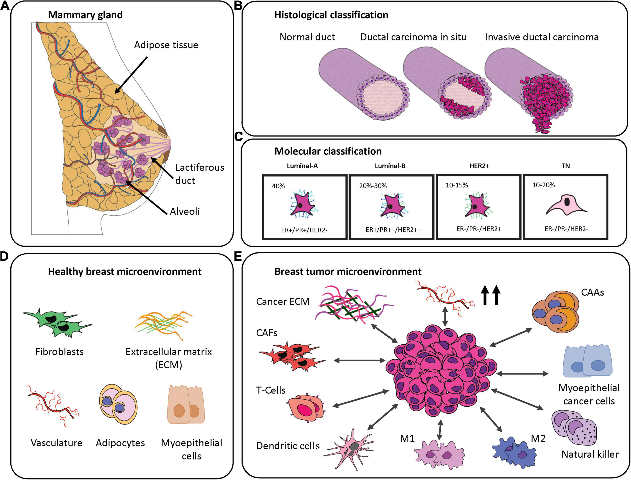 Breast cancer classification and breast-specific tumor microenvironment. (A) Graphical representation of the mammary gland. (B) Histological classification of the breast cancer subtypes. Magenta represents cancerous cells. (C) Molecular classification of the breast cancer subtypes demonstrating their frequency and commonly associated markers. (D) Schematic representation of components of the most abundant healthy mammary gland microenvironment. (E) Components often transformed in the breast tumor microenvironment.