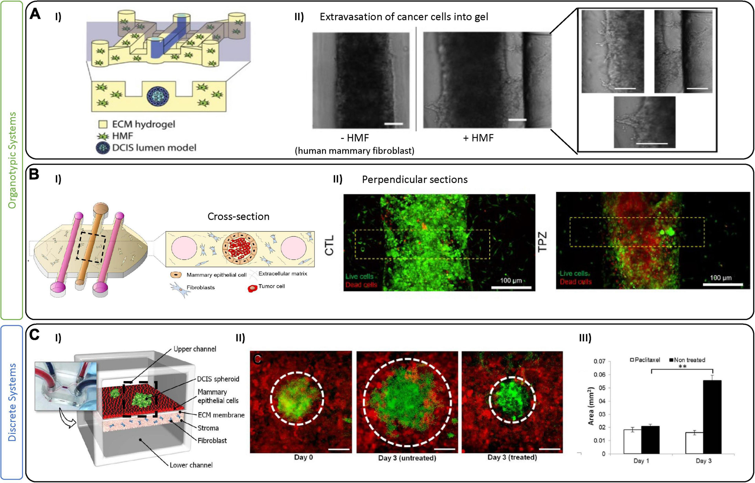Tumor-on-chip devices for ductal in situ carcinoma. (A) Example of fibroblast-associated DCIS migration. (I) Schematic representation of the tumor-on-chip device. The central lumen is lined with MCF-10 (normal epithelial cells) to mimic a mammary duct and then seeded with cancer cells (MCF10aDCIS). Fibroblasts are added in a collagen I hydrogel to adjacent chambers. (II) Bright-field images show the mammary duct filled with DCIS cells either alone or in co-culture with fibroblasts (HMF), which promote an invasion (as seen in right most images). Scale bars are 100 μm. Figures are adapted from Bischel et al. (2015). (B/C) Example of a 3D DCIS lumen model with additional perfusion channels. (I) Schematic of the device with three channels generated by removable PDMS rods that create a centrally lined lumen (MCF10 cells) and 2 flanking lumens to perfuse media, metabolites or drugs. Similar to the model in (A), the central lumen is filled with DCIS cancer cells and fibroblasts in the surrounding hydrogel. (II) Live/dead images showing control and Tirapazamine (TPZ) treated DCIS in the lumen. After 3 days in culture, cell viability was evaluated demonstrating TPZ-associated toxicity in the center (hypoxic region) of the lumen. Figures adapted from Ayuso et al. (2018). (C) An example of a multi-layer perfusable DCIS model. (I) Schematic figure showing compartmentalized DCIS spheroids on top of a mammary epithelial layer with fibroblasts in a collagen gel in a bottom layer. (II) DCIS spheroids at day 0, and day 3 with and without paclitaxel. (III) Paclitaxel treatment was shown to prevent further growth of the DCIS spheroids in this model. Scale bars are100 μm. ∗∗p < 0.05. Figures are adapted from Choi et al. (2015).
