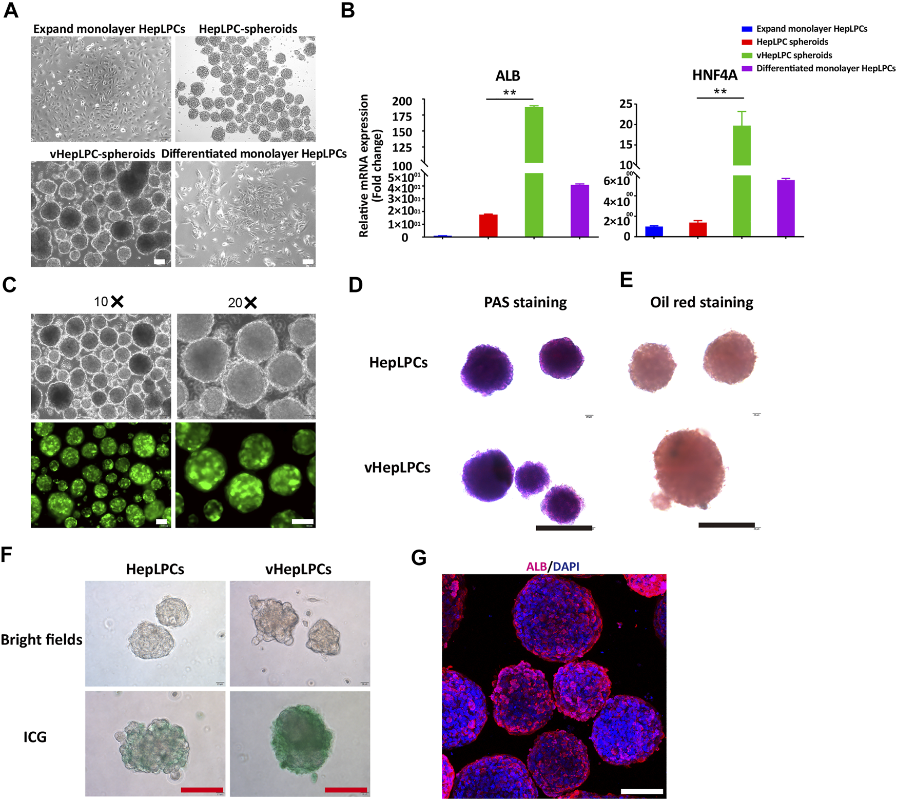 FIGURE 1. Establishment of a co-culture system using HepLPCs and HUVECs. (A) Representative bright-field images of HepLPCs in expandable monolayer HepLPCs, HepLPCs spheroids, vHepLPC spheroids, and differentiated monolayer HepLPCs. (B) Gene expression was analyzed by qRT-PCR. Hepatic functional markers (ALB, HNF4A) were detected in four groups. Data are normalized to the expandable monolayer HepLPCs group. (C) Fluorescence morphology of HepLPC spheroids on carriers. (D–F) Periodic acid-Schiff (PAS) staining, oil red staining, and ICG staining of HepLPCs (upper panel) and vHepLPC spheroids (lower panel). (G) The expression of ALB was determined by immunofluorescent staining in vHepLPCs. Nuclei were counterstained with DAPI. Data are shown as mean ± SEM. **p < 0.01. Scale bars, 100 µm.