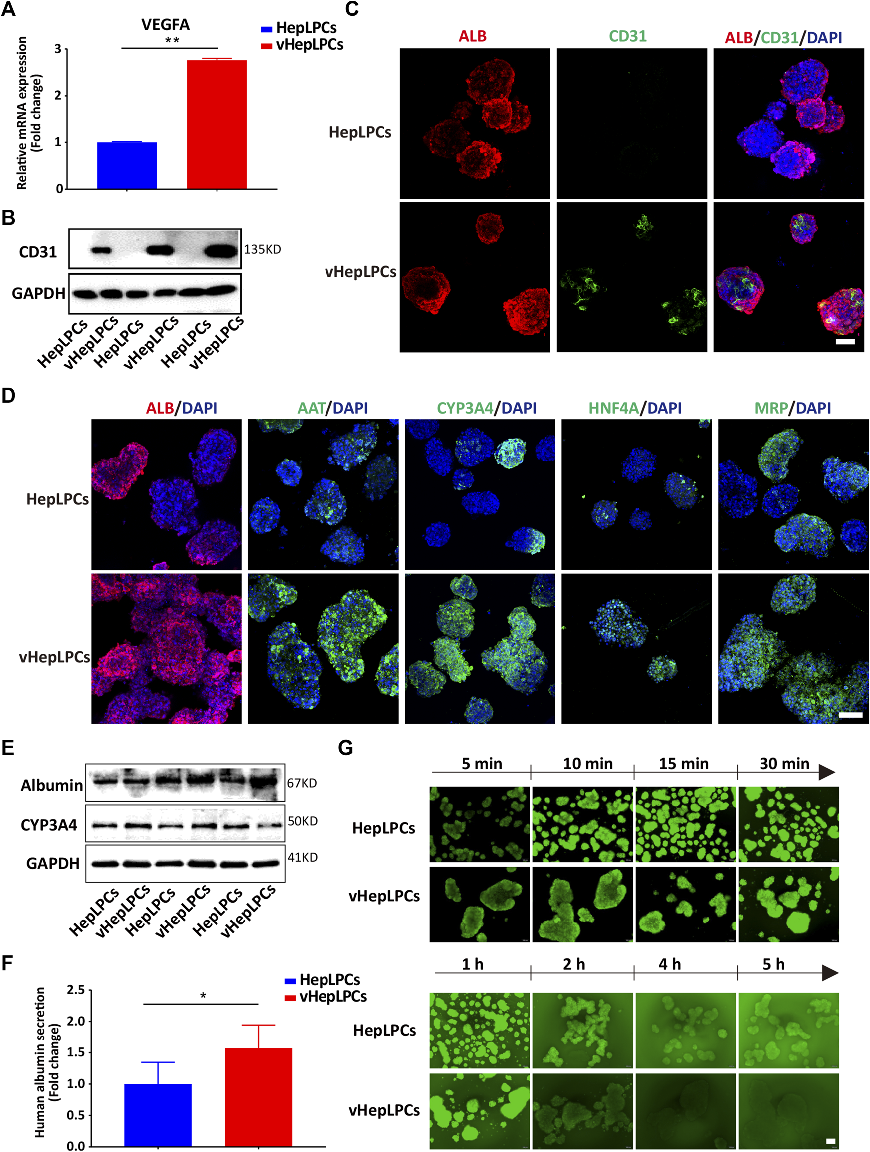 FIGURE 2. Co-culture of HepLPCs and HUVECs promoted HepLPCs maturation. (A) VEGFA expression was measured by qRT-PCR. Data are normalized to HepLPCs. (B) Western blot analysis of the expression of CD31 (n = 3 per group). (C) The expression of ALB and CD31 in HepLPCs and vHepLPCs was determined by co-immunofluorescent staining. Nuclei were counterstained with DAPI. (D) Immunofluorescent staining analyses of the expression of mature hepatic markers after co-culture with HUVECs, ALB, AAT, CYP3A4, HNF4A and MRP. Nuclei were counterstained with DAPI. (E) Western blot analysis of the expression of ALB and CYP3A4 in two groups (n = 3 per group). (F) Quantitative analysis of ALB secretion in supernatants. Data are normalized to HepLPCs (n = 3 per group). (G) Time-lapse imaging of microvilli network in HepLPCs and vHepLPCs at 5 min to 5 h of incubation with CDFDA (1 μM). Fluorescence images show both cell types can transport CDFDA, but vHepLPCs exhibited faster transport efficiency than HepLPCs. Data are presented as means ± SEM. *p < 0.05, **p < 0.01. Scale bars, 100 µm.