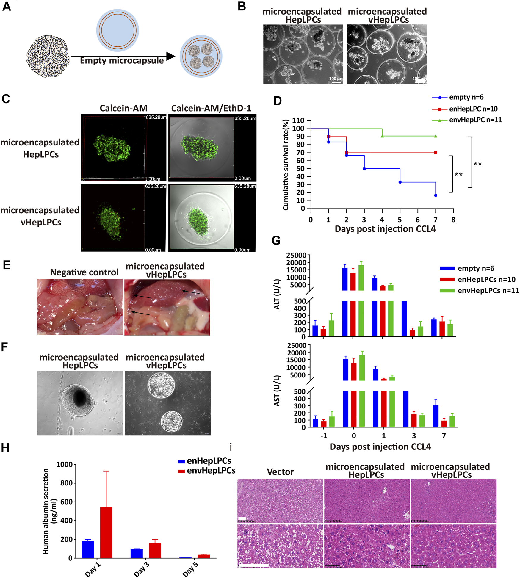 FIGURE 3. Alginate microencapsulated vHepLPC spheroids significantly improved the survival rate of mice with liver injury. (A) Alginate microcapsule coating protocol diagram. (B) Bright-field image of coated spheroids. (C) Cell viability test after microencapsulation. (D) Survival curve for acute liver injury mice with microencapsulated HepLPC spheroids (n = 10), vHepLPC spheroids (n = 11), or empty (n = 6) transplantation. (E) The microcapsule particles were enriched around the liver after transplantation. (F) Microcapsules recovered from the mouse abdominal cavity. (G) Serum levels of ALT and AST in CCL4-treated mice before and after transplantation (days one through seven) of microencapsulated spheroids. (H) Serum levels of human albumin secretion in CCL4-treated mice. (I) H&E staining 7 days after transplantation of alginate microencapsulated spheroids. The liver tissue after transplantation was significantly closer to normal tissue morphology. Data are presented as means ± SEM. **p < 0.01. Scale bars, 100 µm.