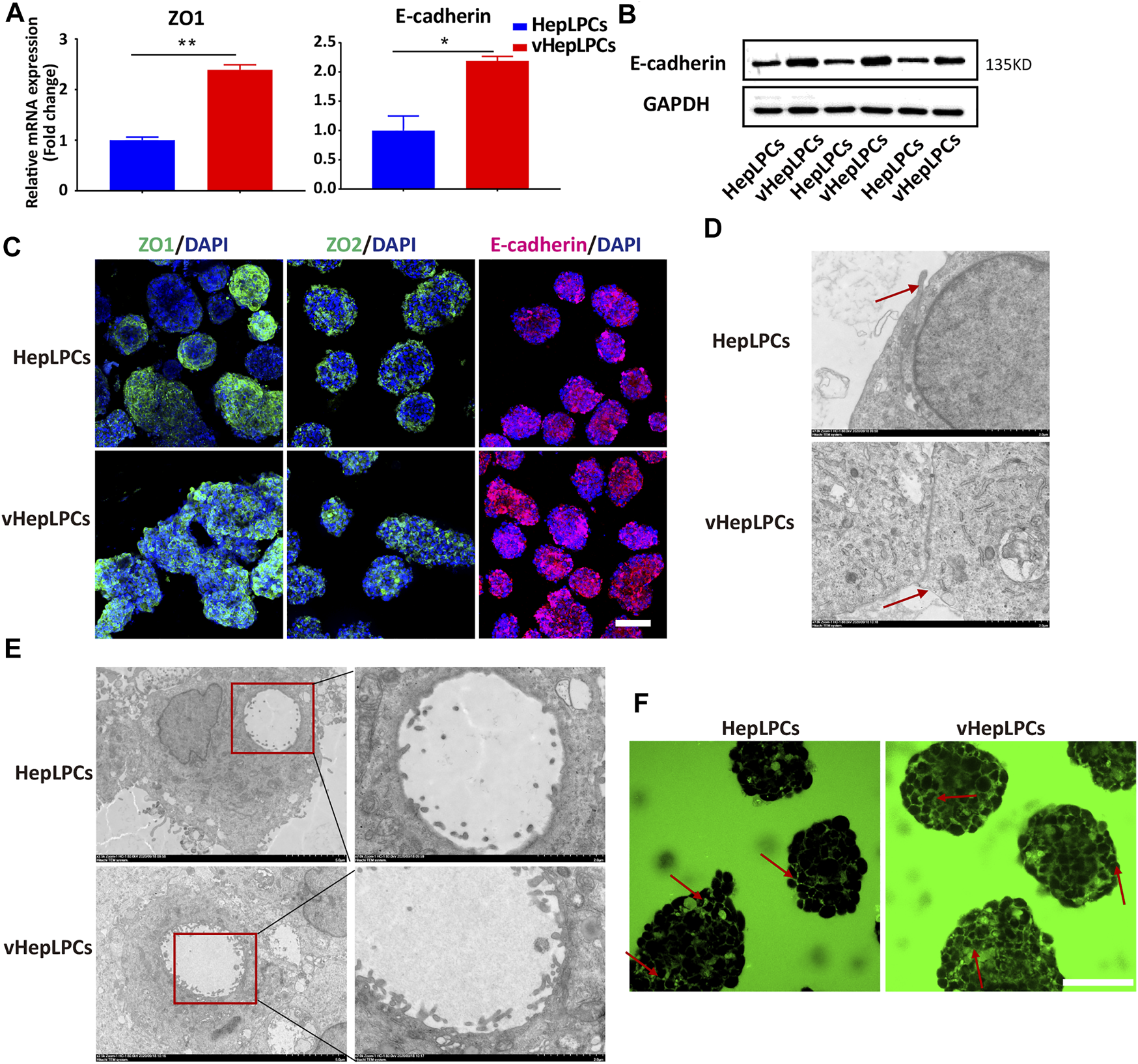 FIGURE 4. Co-culture of HepLPCs and HUVECs enhanced cell-cell tight junctions. (A)Gene expression was analyzed by qRT-PCR. Tight adhesion markers (ZO1, E-cadherin) were assessed. Data are normalized to HepLPCs. (B) Western blot analysis of the expression of E-cadherin in two groups (n = 3). (C) Immunofluorescent staining analyses of the expression of the tight junction markers, ZO1, ZO2, and E-cadherin, in HepLPCs and vHepLPCs. Nuclei were counterstained with DAPI. (D) Transmission electron microscopy results showed tight junctions between cells. vHepLPCs exhibited more complete tight junctions between cells, as indicated by the red arrow. (E) Representative TEM images. Electron microscopic analysis showed that the abundance and height of microvilli in vHepLPCs were significantly higher than in HepLPCs, suggesting that these structures are morphologically equivalent to villi that form in the bile canaliculi. (F) Live-imaging of CDF flow pathway from HepLPCs and vHepLPC spheroids. Red arrow pointed that the bile canaliculi network was formed by continuous tight junctions between polarized hepatocytes in vHepLPCs in magnificated pictures. Data are presented as means ± SEM. *p < 0.05, **p < 0.01. Scale bars, 100 µm.