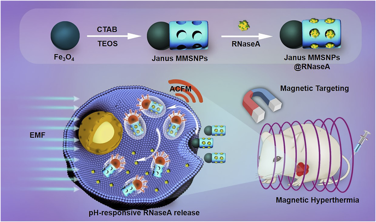 SCHEME 1. Schematic illustration of the preparation of RNaseA-loaded Janus MMSNPs and their application for magnetically targeted and protein/hyperthermia combination therapies of breast cancer.