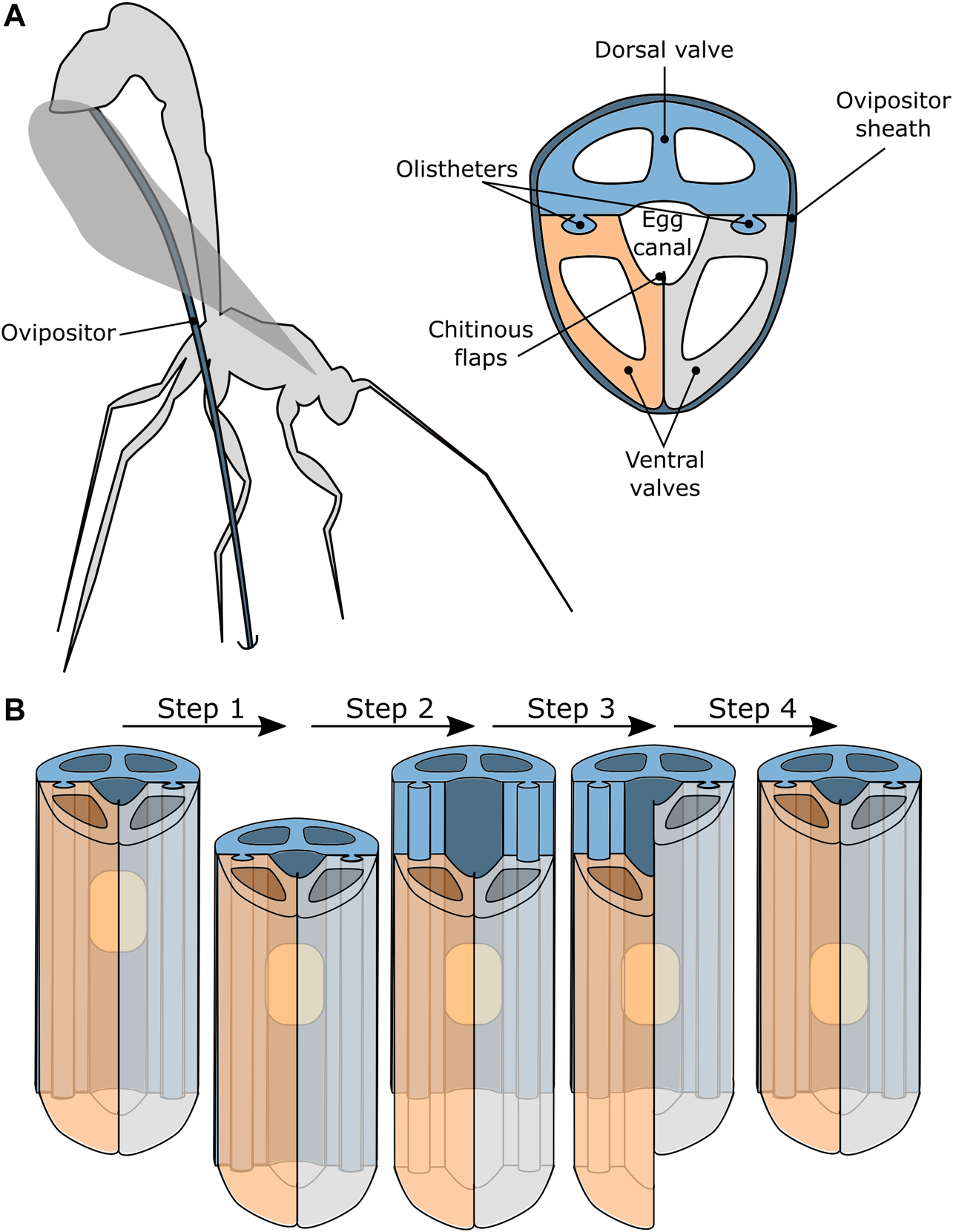 The ovipositor generally consists of three independently translating valves: one dorsal valve and two ventral valves. The valves are enclosed by the ovipositor sheath and can slide axially with respect to each other while being kept in place radially by a tongue-and-groove connection, called olistheter (Ahmed et al., 2013). The chitinous flaps of the ventral valves are thought to provide a seal that prevents the egg from escaping the egg channel during oviposition (Ahmed et al., 2013).