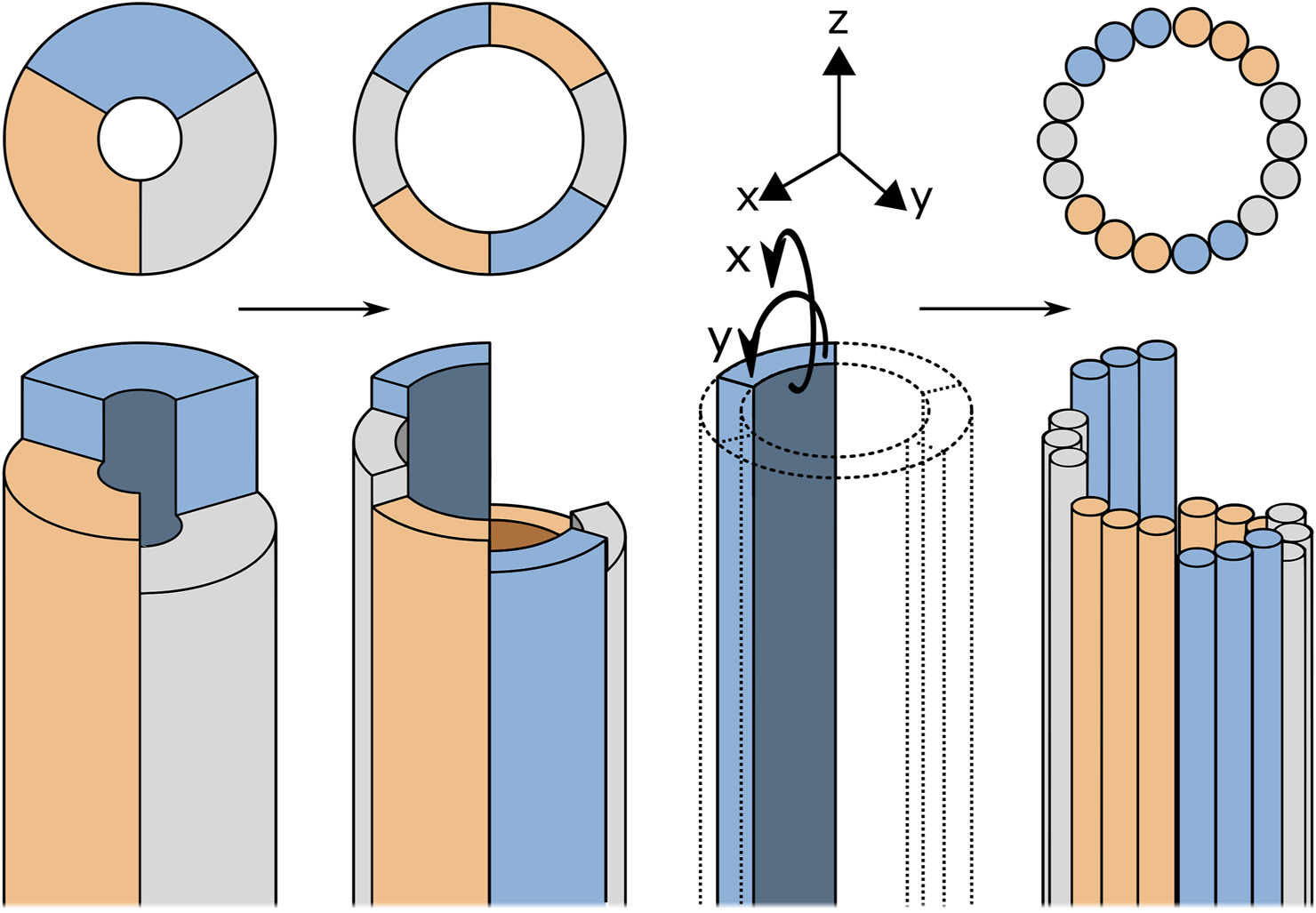 Following the ovipositor mechanism, the basis of the proposed design are valves that, through small oscillatory translations, transport the tissue. In the design of Sakes et al. (2020), the complex-shaped valves of the wasp are simplified to rigid semi-circular blades, see Figure 4. These semi-circular blades are rigid but could be made out of flexible material in order to create a flexible transport mechanism. However, semi-circular blades have a preferred axis of bending, allowing relatively easy bending around the x-axis, see in Figure 4, but a strong resistance to bending around the y-axis. Together, the blades form a tubular structure and bending this tube would always require multiple blades to bend in their unpreferred direction. Therefore, an alternative must be found for these semi-circular blades. Structures with a round cross-section do not have a preferred axis of bending, ensuring equal flexibility in both bending planes. It was therefore chosen to use cylindrical blades that exhibit high flexibility, such as cables.