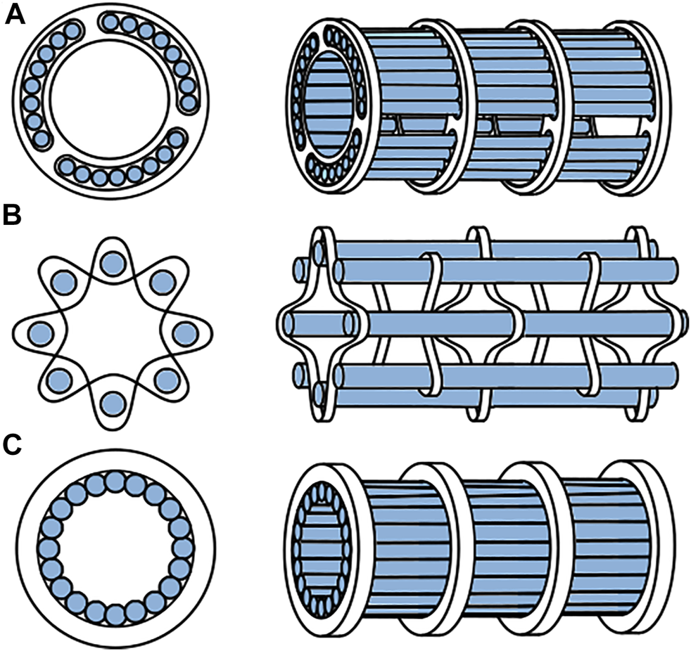 Different options to create an open lumen while still allowing the cables to translate. (A) rings with holes, (B) woven structures, (C) ring magnets.