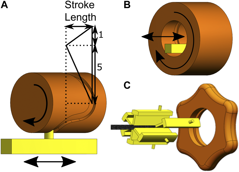 Representation of the cam design. (A) The effect of the groove on the motion sequence of the sliders. (B) Schematic drawing of the inside-out barrel cam. (C) The cam (orange) and sliders (yellow) of the transport mechanism.
