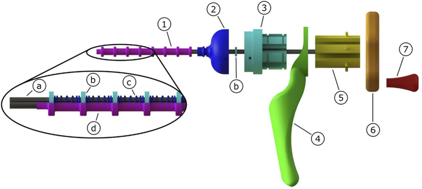 Schematic representation of the flexible transport mechanism consisting of 1) flexible shaft, 2) tip, 3) slider house, 4) hand grip, 5) sliders, 6) cam, 7) crank. The flexible shaft consists of a) cables that form a lumen due to their attraction to the b) ring magnets. The ring magnets are kept in place by c) compression springs, and all is enclosed by a d) heat shrink tube.