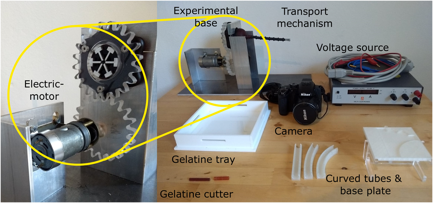 Experimental facility. The experimental facility consisted of an electromotor connected to a voltage source and the handle of the transport mechanism through a gear mechanism, the transport mechanisms placed inside an aluminium frame, a camera to record the experiments, a based plate containing 3D-printed tubes for the shaft curvature experiment, and a gelatine tray with cutter for the manufacturing of the tissue phantoms.
